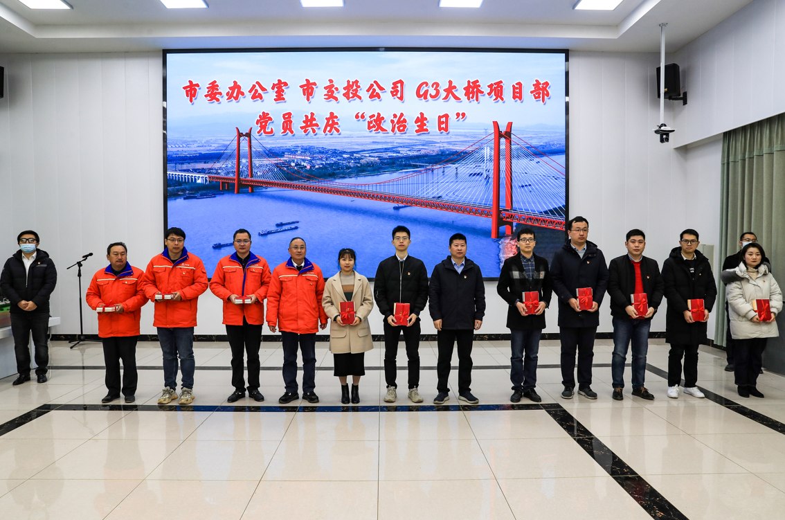 12月24日上午,集團(tuán)公司聯(lián)合市委辦、G3橋項(xiàng)目部舉辦共慶黨員“政治生日”活動(dòng)。市委常委、秘書長(zhǎng)胡啟書,中鐵大橋局副總經(jīng)理季躍華,集團(tuán)公司黨委副書記方勁松、黨委委員、紀(jì)委書記章新華、黨委委員、副總經(jīng)理范美霞以普通黨員身份參加。