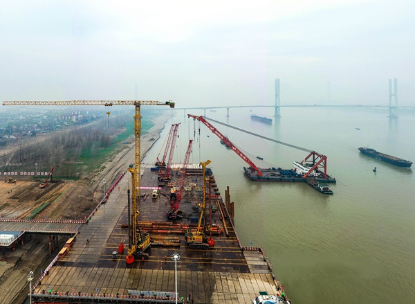 4日上午8時30分,位于長江北岸G3銅陵長江公鐵大橋3號墩的施工現(xiàn)場,上百名橋梁建設(shè)者正在進(jìn)行施工平臺的鋪設(shè)和完善,以及鋼護(hù)筒的插打作業(yè)。現(xiàn)場塔吊林立,焊花四濺,一派繁忙的景象。中鐵大橋局G3銅陵長江公鐵大橋項(xiàng)目部一分部黨支部書記趙懿告訴記者,目前大型吊船、履帶吊、塔吊、旋挖鉆機(jī)等大型設(shè)備已經(jīng)到位,“2022年,我們計(jì)劃實(shí)施橋墩鉆孔樁、承臺、墩身等施工,年度計(jì)劃投資10億多元。”