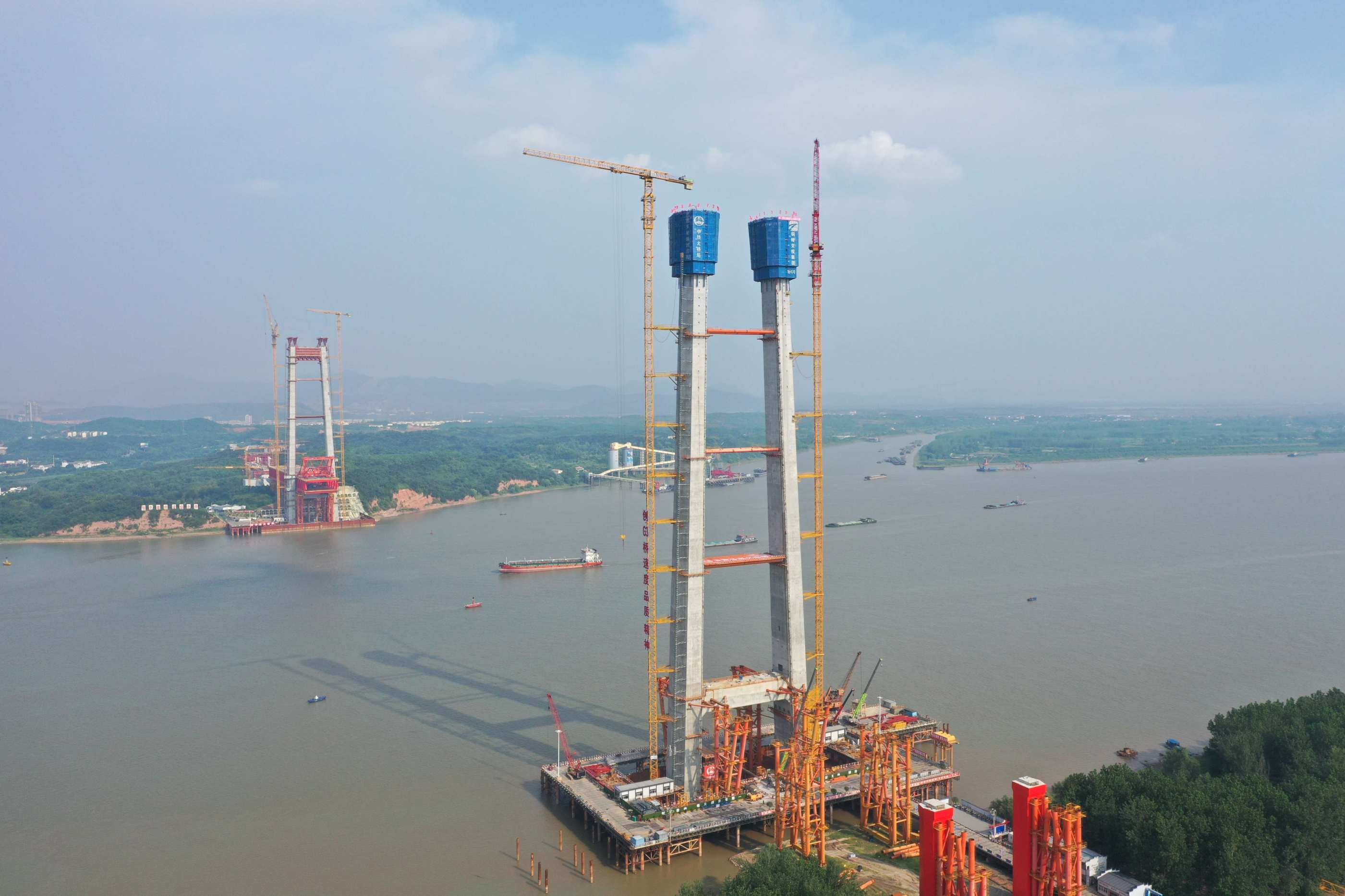 G3銅陵長(zhǎng)江公鐵兼具斜拉橋和懸索橋兩種橋型的優(yōu)勢(shì),具有“跨度大、荷載重、結(jié)構(gòu)新”的特點(diǎn)。大橋路線全長(zhǎng)11.88公里,其中跨江主橋長(zhǎng)1505米,主跨988米,具有“高速公路、城際鐵路、貨運(yùn)鐵路”三種過(guò)江功能,大橋按照“四線鐵路+六車道高速公路”的標(biāo)準(zhǔn)建設(shè)。大橋南北各有一座主塔,作為懸掛大橋懸索主纜和斜拉索的支柱,主塔采用鋼筋混凝土門型結(jié)構(gòu),設(shè)上下兩層橫梁。其中3號(hào)主塔高228.5米,相當(dāng)于81層樓高,共分26個(gè)節(jié)段進(jìn)行施工,混凝土總方量3.74萬(wàn)方。