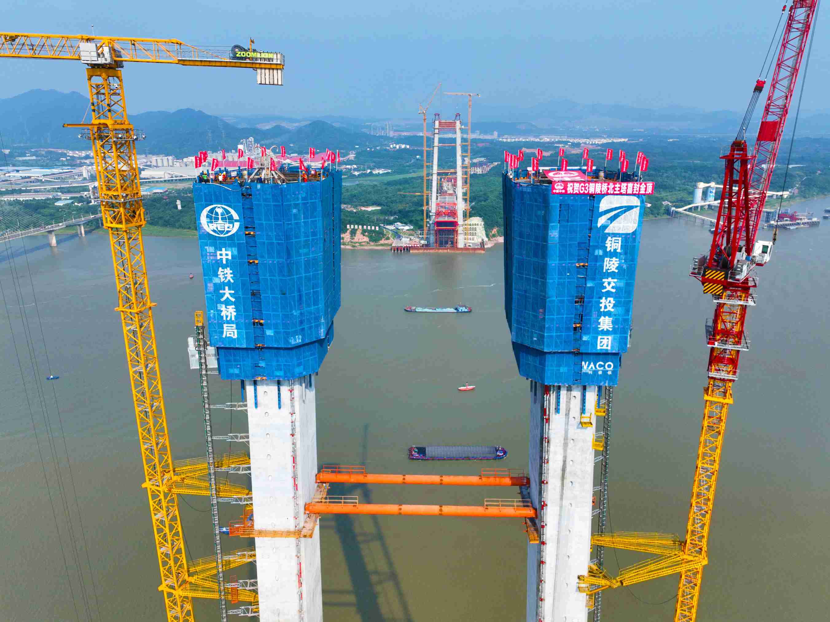 8月18日,由銅陵市交投集團(tuán)投資建設(shè)、中鐵大橋院設(shè)計(jì)、中鐵大橋局承建的世界首座雙層斜拉-懸索協(xié)作體系大橋——G3銅陵長(zhǎng)江公鐵大橋北岸3號(hào)主塔順利封頂,至此,大橋南北兩座主塔全部封頂,施工取得重大進(jìn)展,大橋?qū)⑷孢M(jìn)入鋼梁架設(shè)階段。