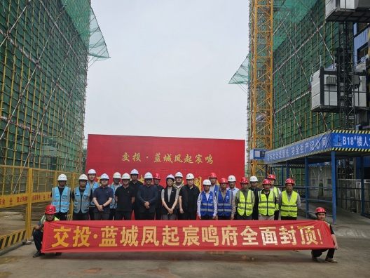5月12日上午,萬里晴空,惠風和暢,鳳起宸鳴項目施工現(xiàn)場掌聲雷動。隨著B18號樓屋面混凝土開始澆筑,意味著項目主體整體封頂。交投置業(yè)總經(jīng)理趙麗及所有參建單位相關(guān)負責人共同見證了項目開工以來最為激動人心的階段性成果。
