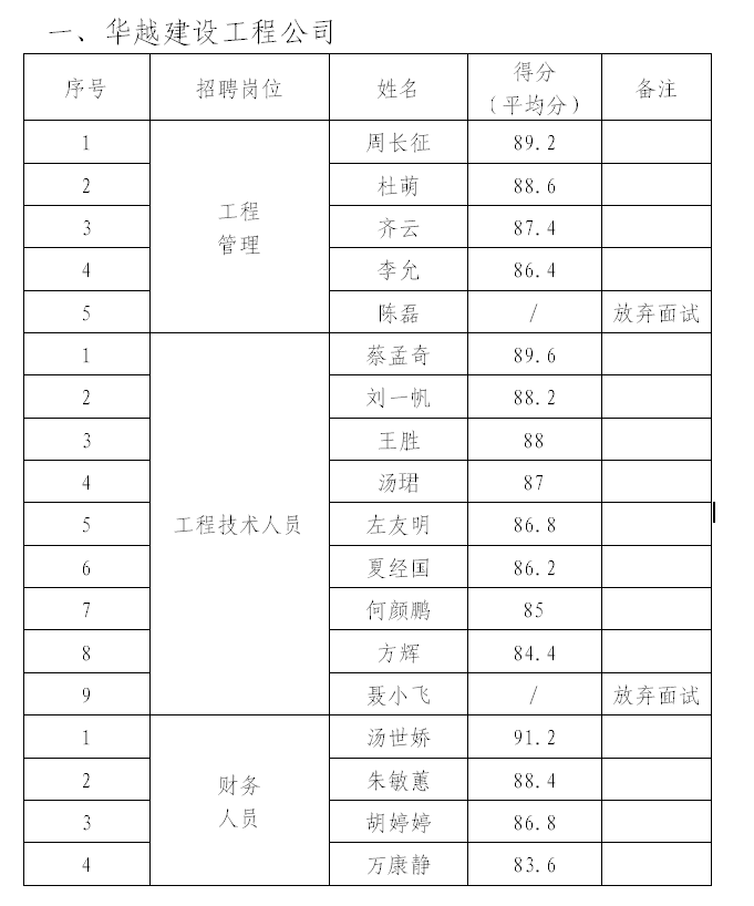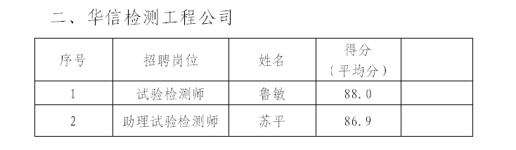 根據(jù)《銅陵華越建設(shè)工程有限公司公開招聘人員公告》、《銅陵市華信工程質(zhì)量檢驗(yàn)有限責(zé)任公司公開招聘人員公告》,于3月1日開展招聘人員面試工作,現(xiàn)將擬招錄人員公示如下: