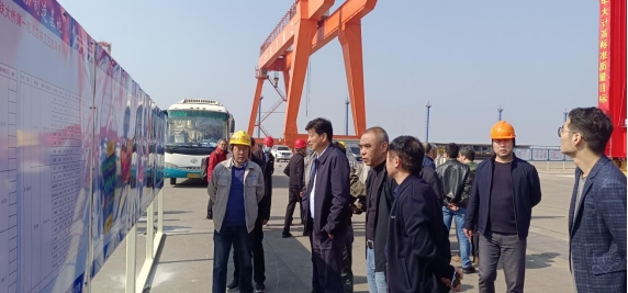 湯世才一行首先前往驗收現(xiàn)場,詳細了解了鋼梁節(jié)段整體制造首節(jié)段總拼過程、結(jié)構(gòu)特點及重難點分析等內(nèi)容,并對質(zhì)量、安全、進度提出了要求及建議。